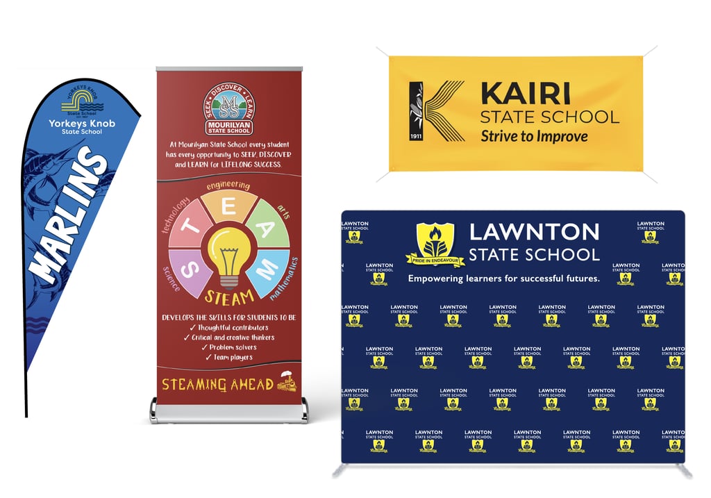 Vinyl banners for fences, parades and events. Media walls, pull up banners, tear drop and bow banner flags. A wide variety of display solutions for your school or school event.