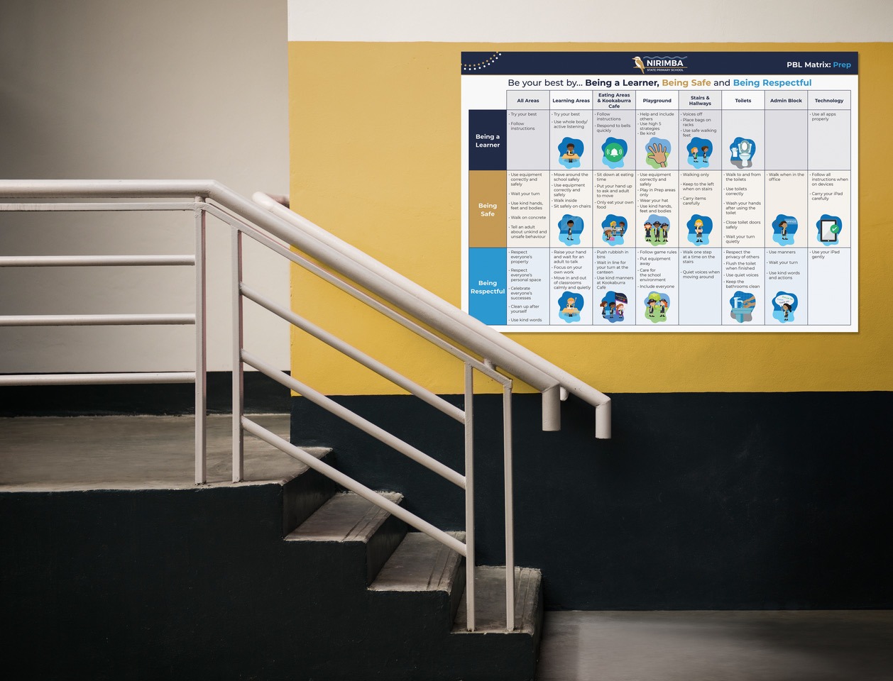 Illustrating school values and expected behaviours. Custom drawn, engaging and highly practical for use on signage and in classrooms.