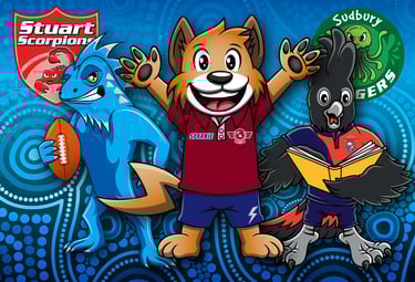 Spruik your school and house teams. Logos, badges and custom drawn mascots, posed to suit your school needs.